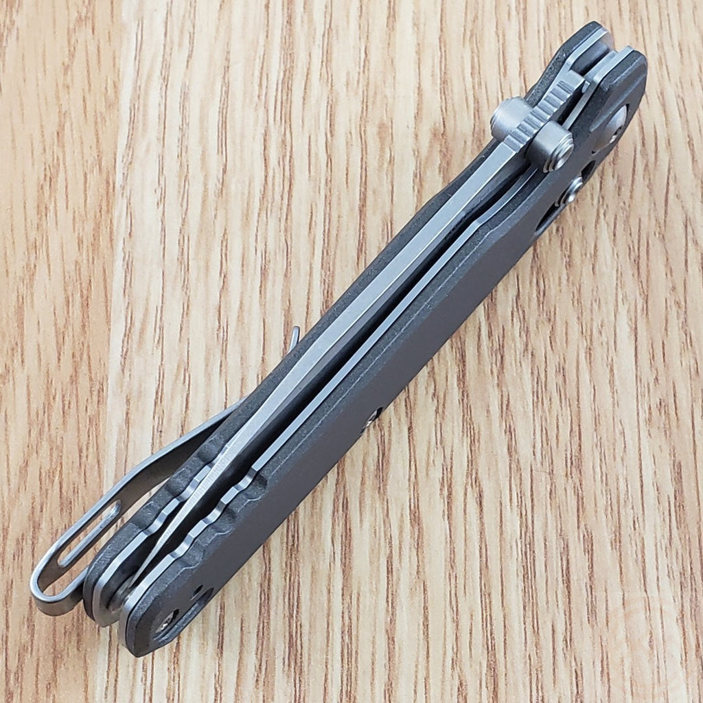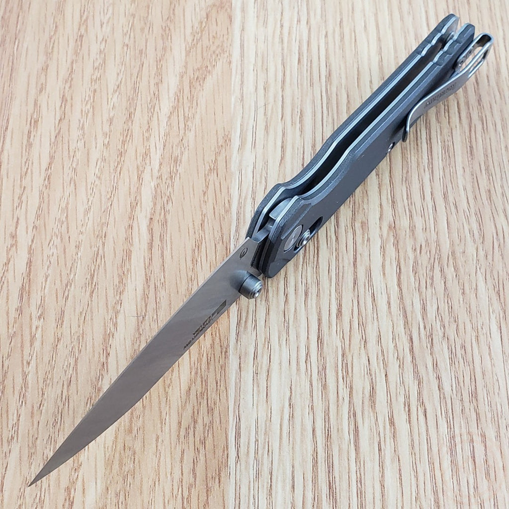 4.25" (10.8cm) closed. 3.13" (7.95cm) stonewash finish CPM MagnaCut stainless drop point blade. Gray anodized aluminum handle. Thumb stud. Lanyard hole. Pocket clip. Boxed.