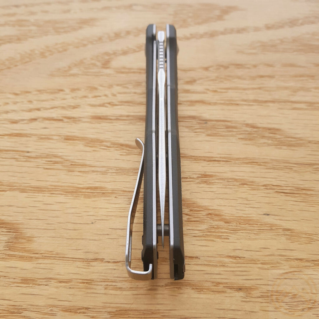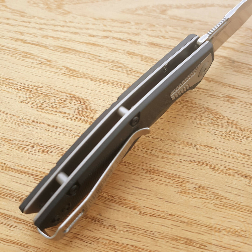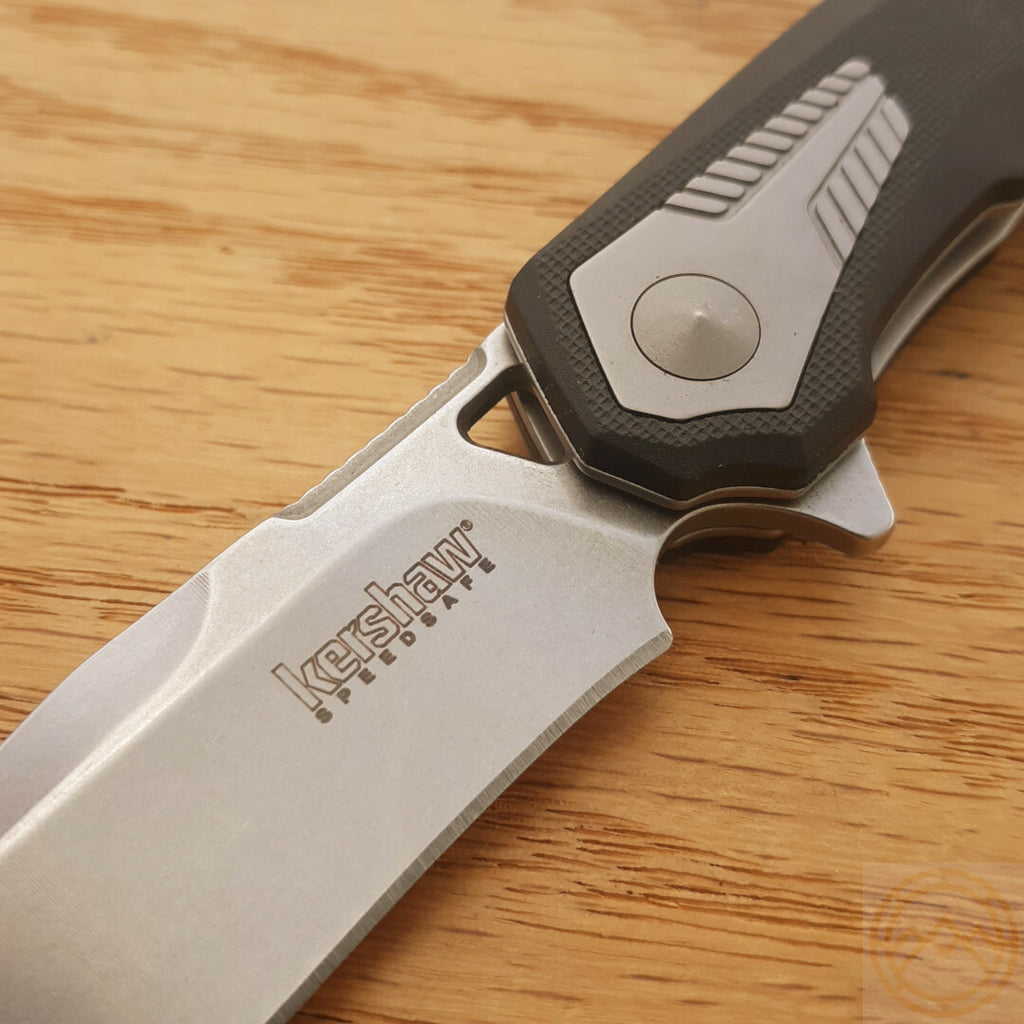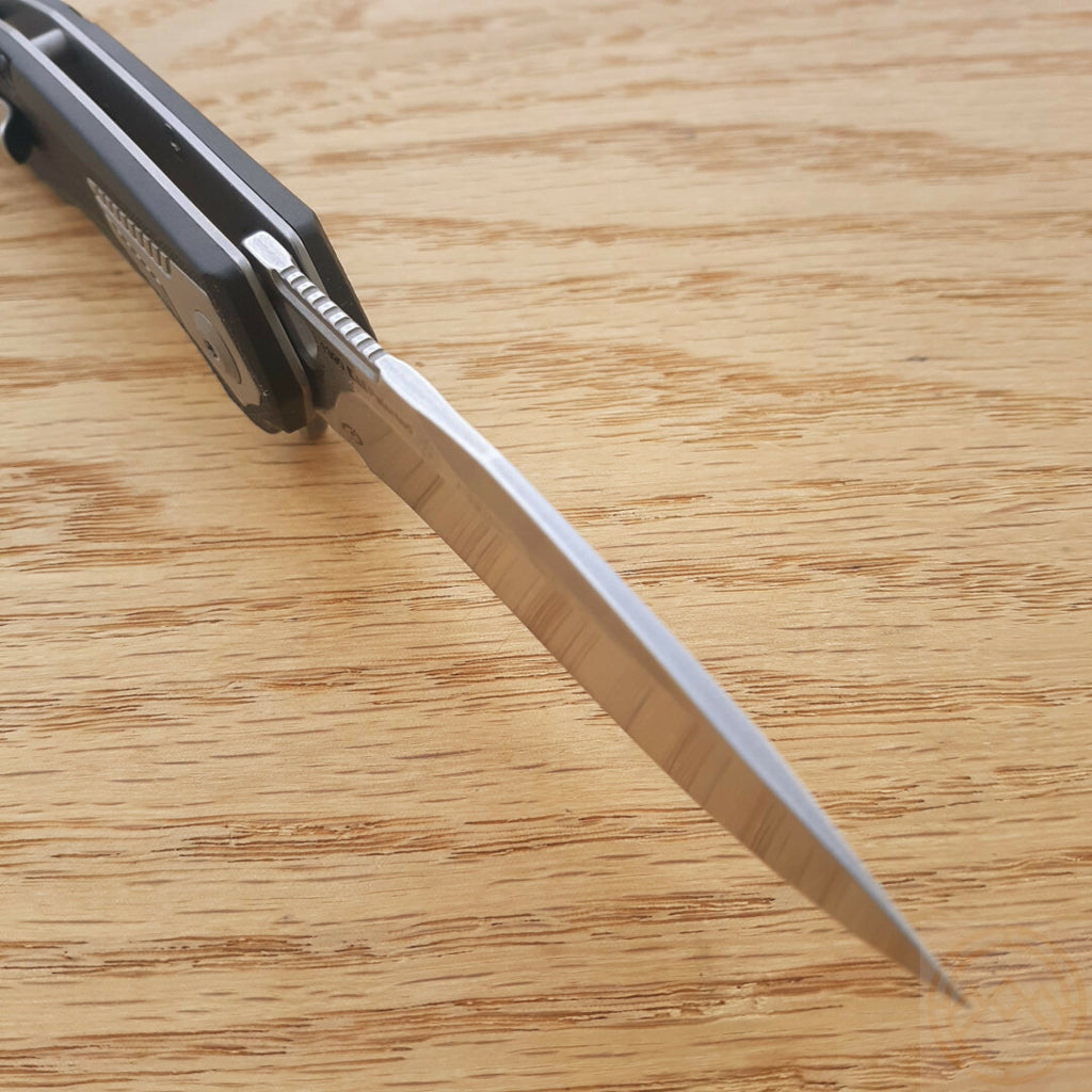 Assisted opening. 4.13" (10.49cm) closed. 3.13" (7.95cm) stonewash finish 4Cr14 stainless blade. Black glass filled nylon handle with steel inlay. Extended tang. Pocket clip. Boxed.