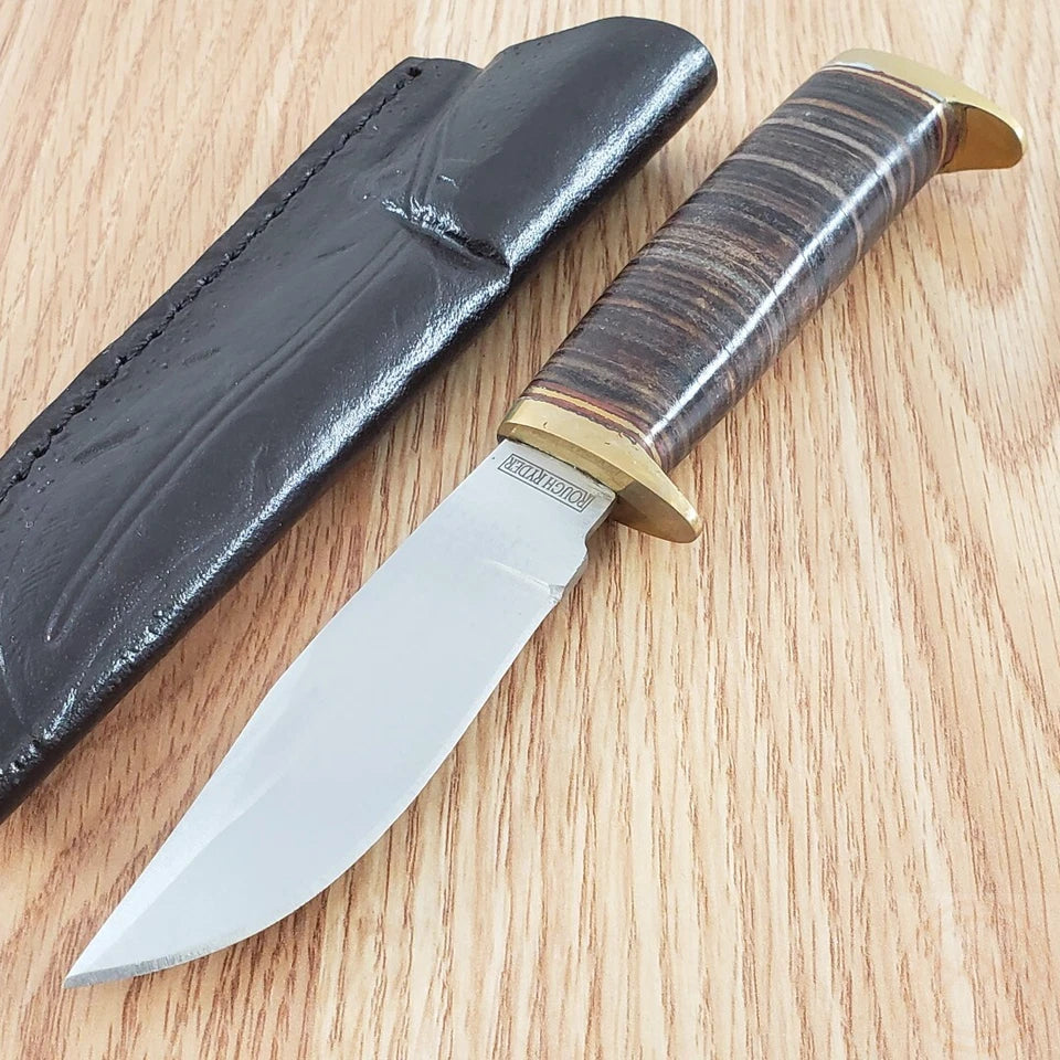 7.25" overall. 3.5" satin finish stainless skinner blade. Brown stacked leather handle. Nickel silver guard and pommel. Brown leather belt sheath. Boxed.