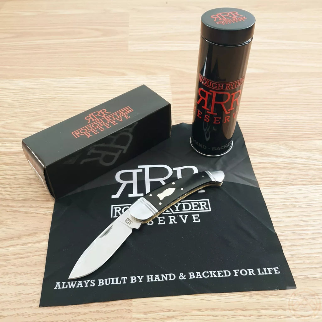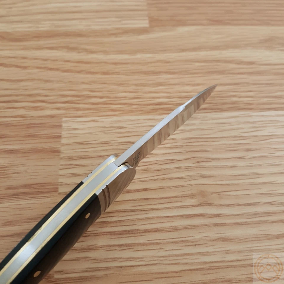 4" (10.16cm) closed. Satin finish stainless blade. Black Micarta handle. Stainless bolster(s). Inlay shield. Boxed.