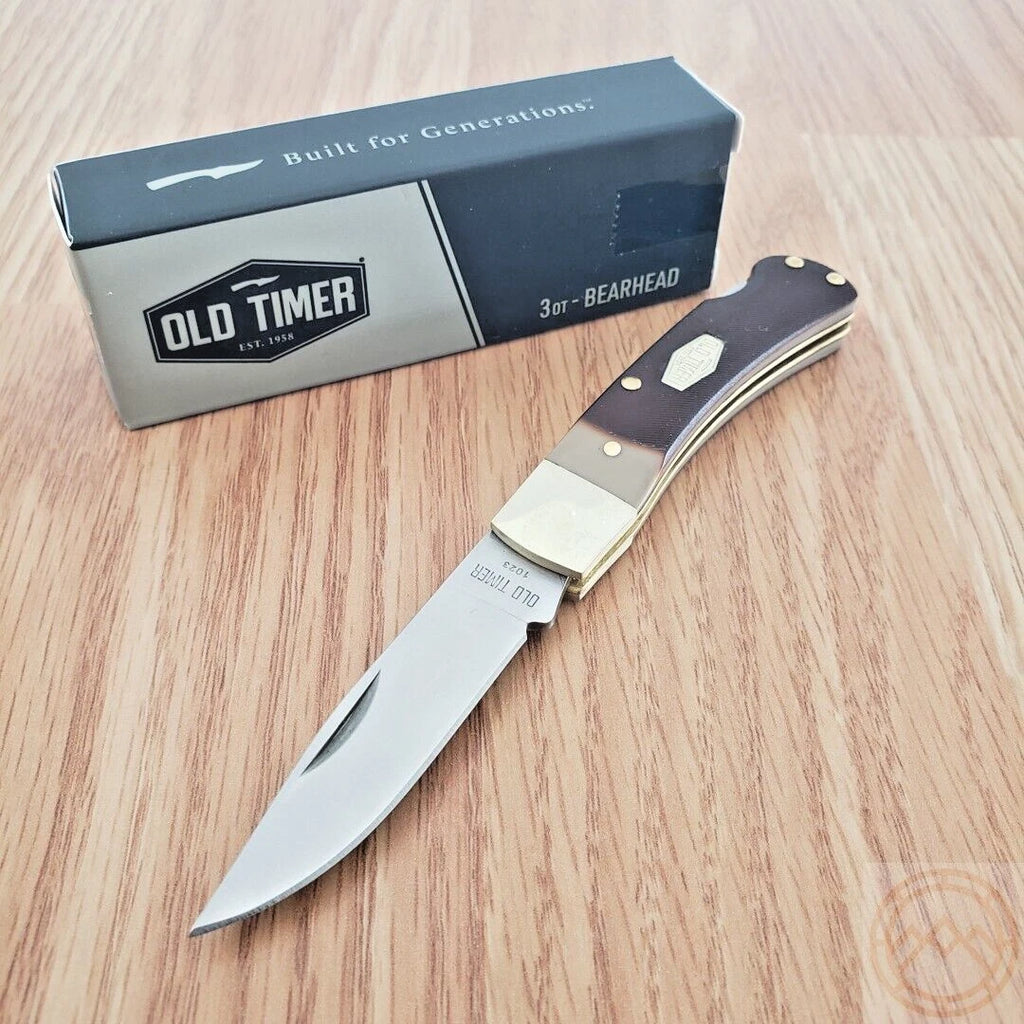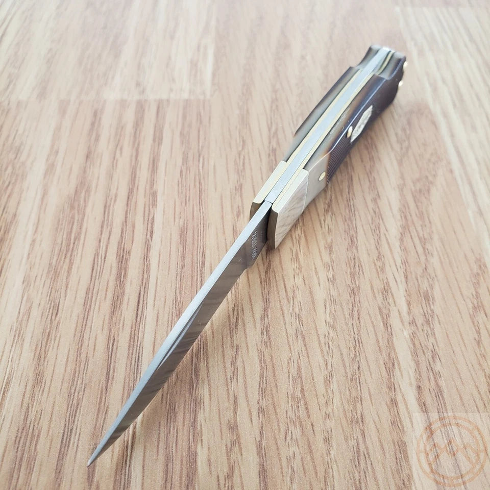 3" closed. Stainless drop point blade. Sawcut Delrin handles with nickel silve bolster and inlay shield.