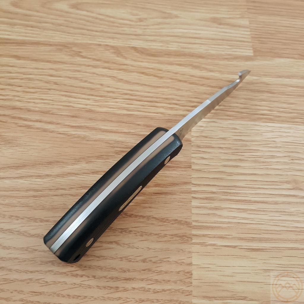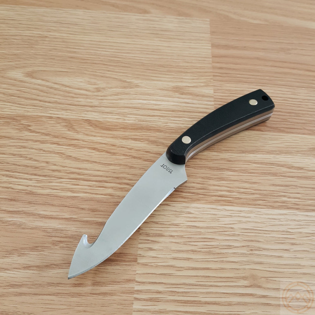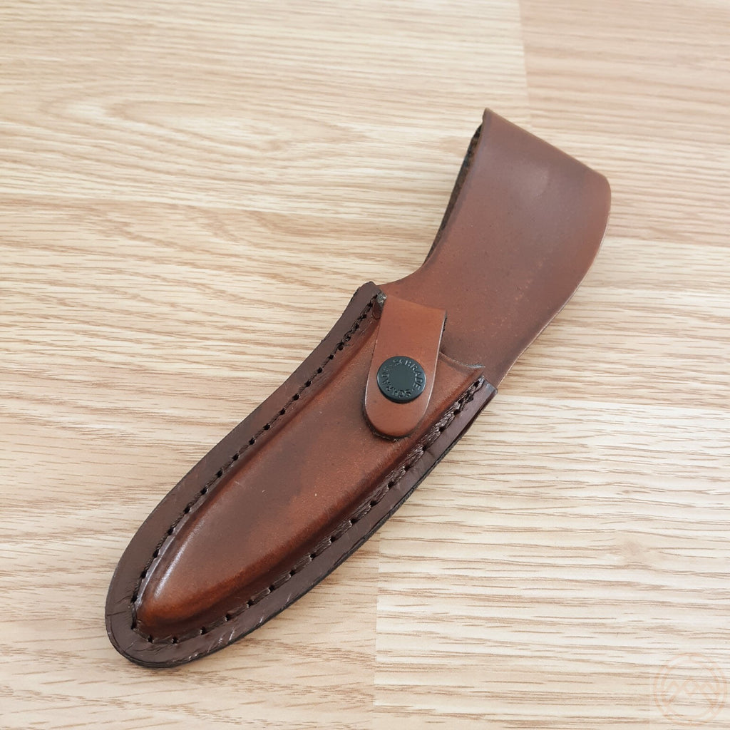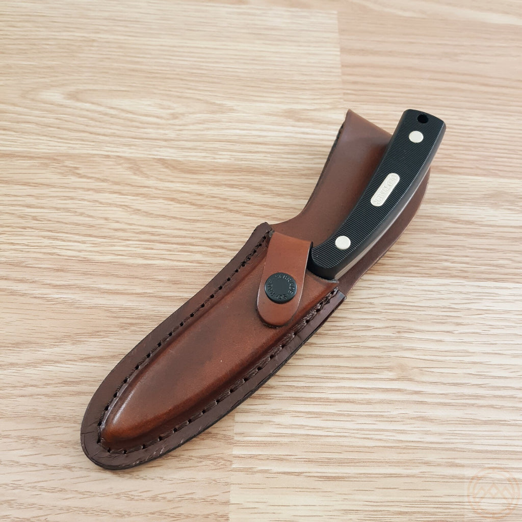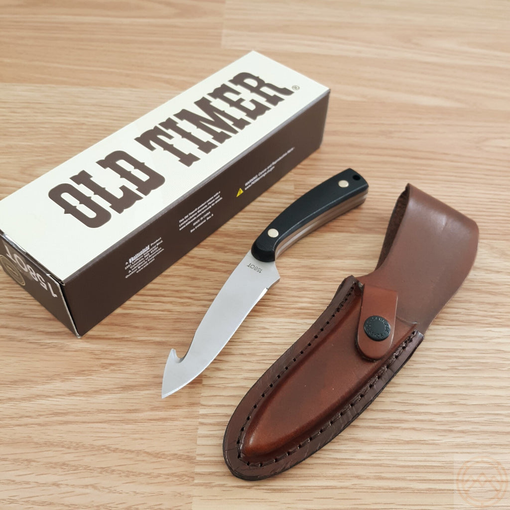 7 1/4" overall. 3 1/2" stainless guthook blade. Full tang. Brown sawcut Delrin handles with Old Timer inlay shield. Brown leather belt sheath.