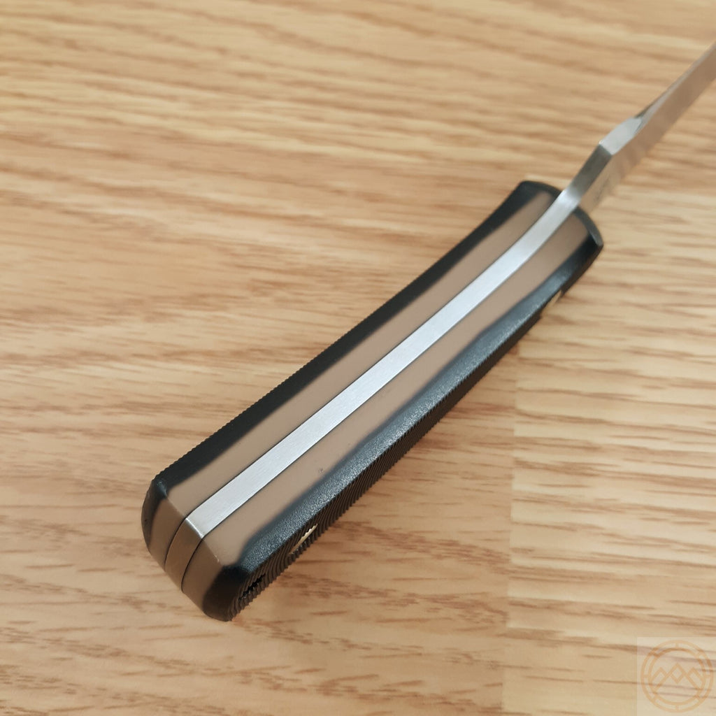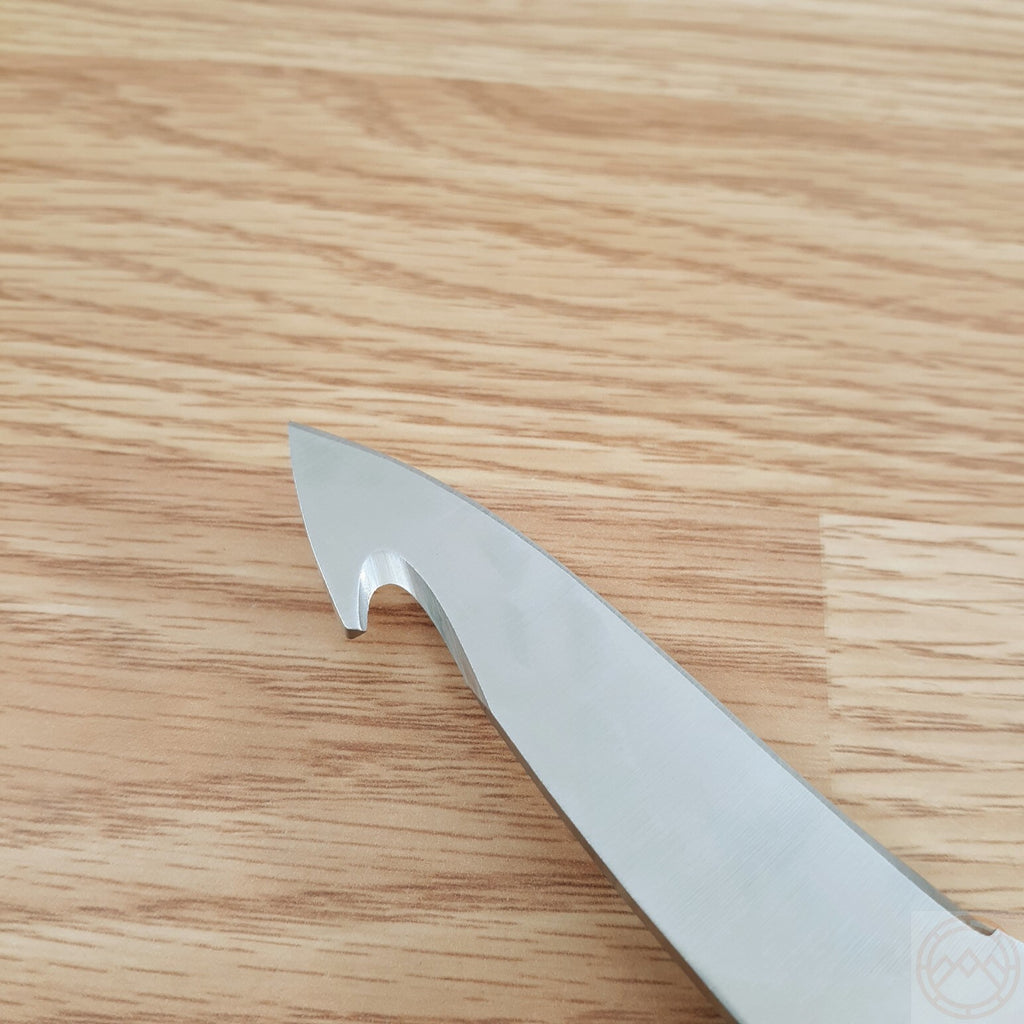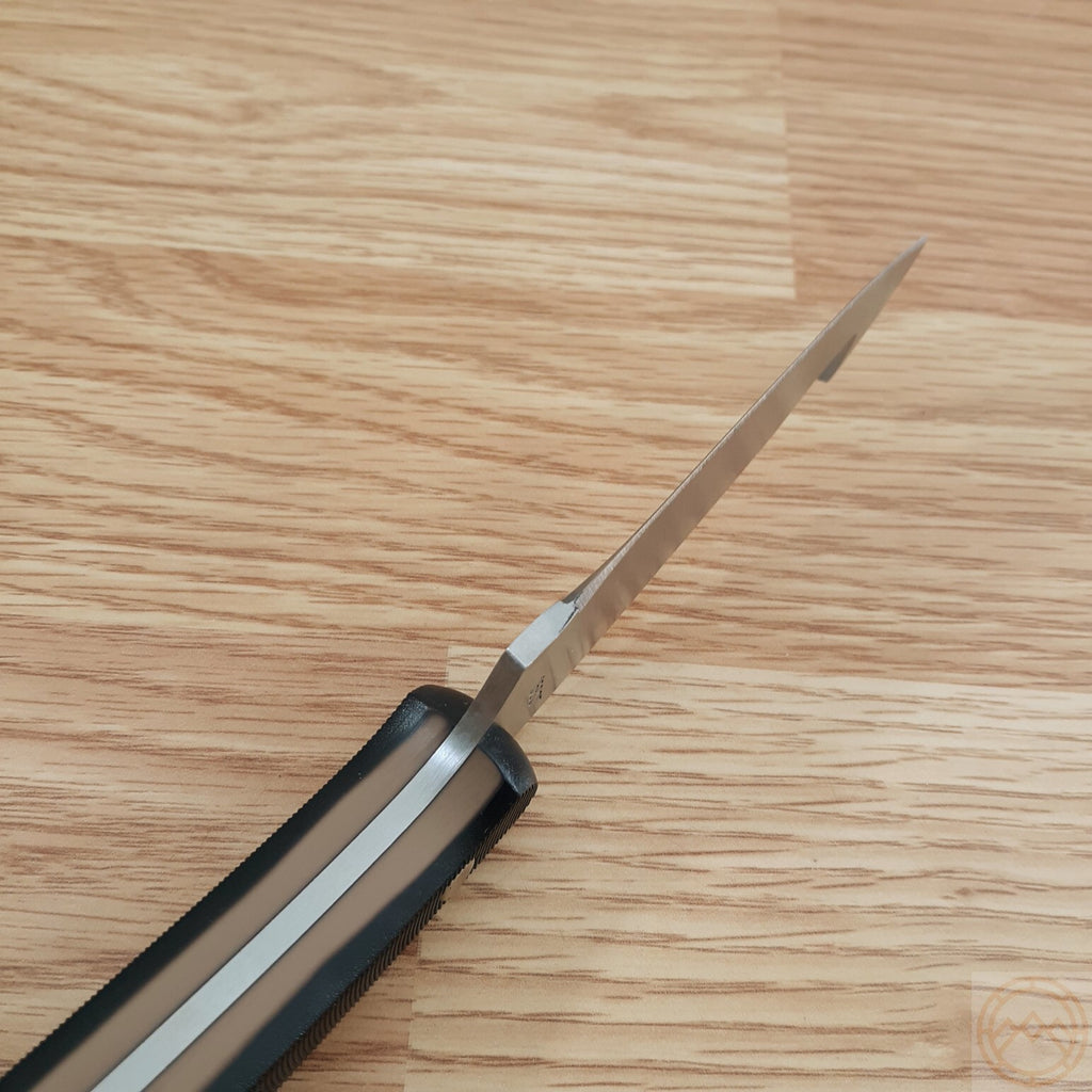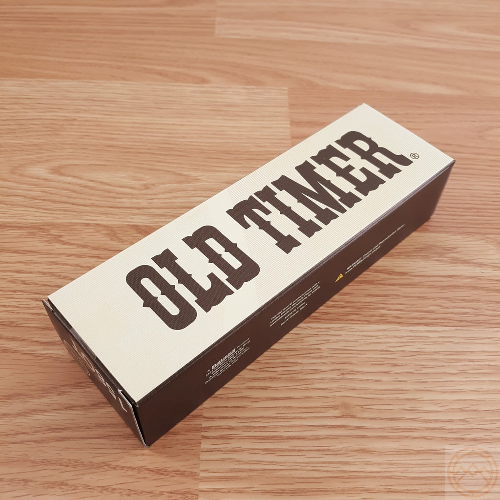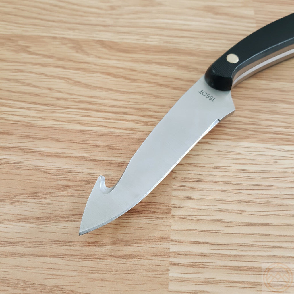 7 1/4" overall. 3 1/2" stainless guthook blade. Full tang. Brown sawcut Delrin handles with Old Timer inlay shield. Brown leather belt sheath.