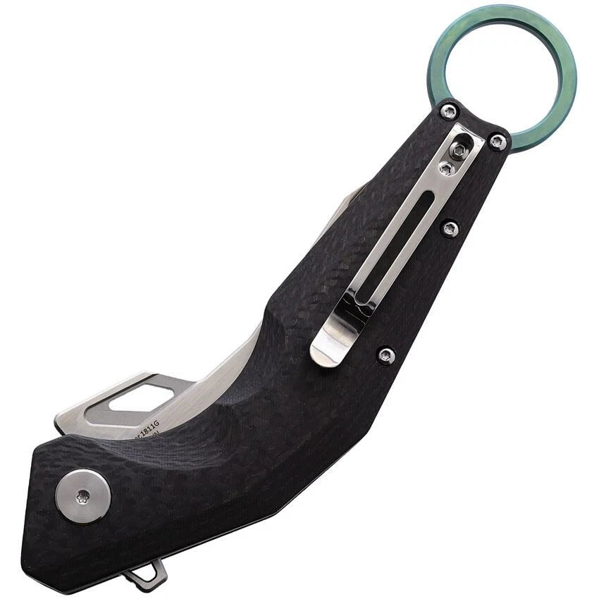 6" closed. 3.75" satin finish S35VN stainless blade. Carbon fiber handle. Extended tang. Finger ring. Pocket clip. Thumb pull. Green liners. Boxed.