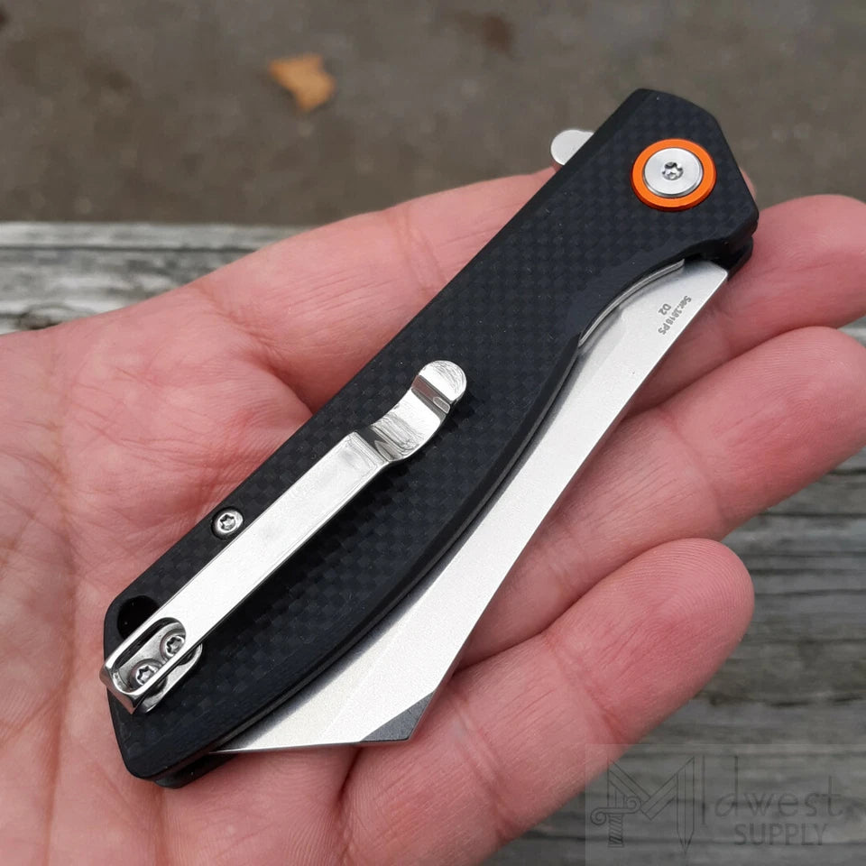 4" closed. 3" stonewash finish D2 tool steel blade. Black textured G10 handle. Extended tang. Lanyard hole. Pocket clip. Boxed.