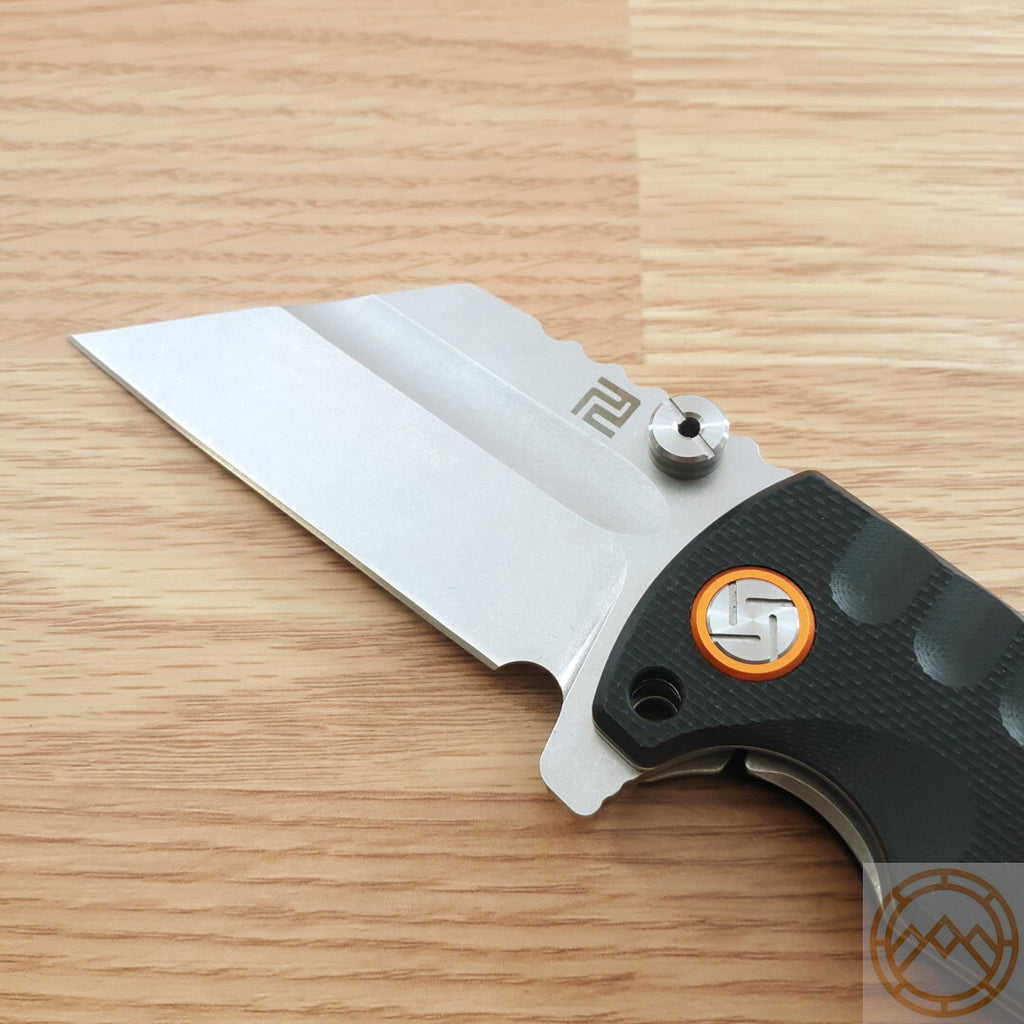 5" (12.7cm) closed. 4" (10.16cm) D2 tool steel blade. Black textured G10 handle. Extended tang. Thumb stud. Pocket clip. Lanyard hole. Satin finish and sand polished blade. Ceramic ball bearing. Boxed.