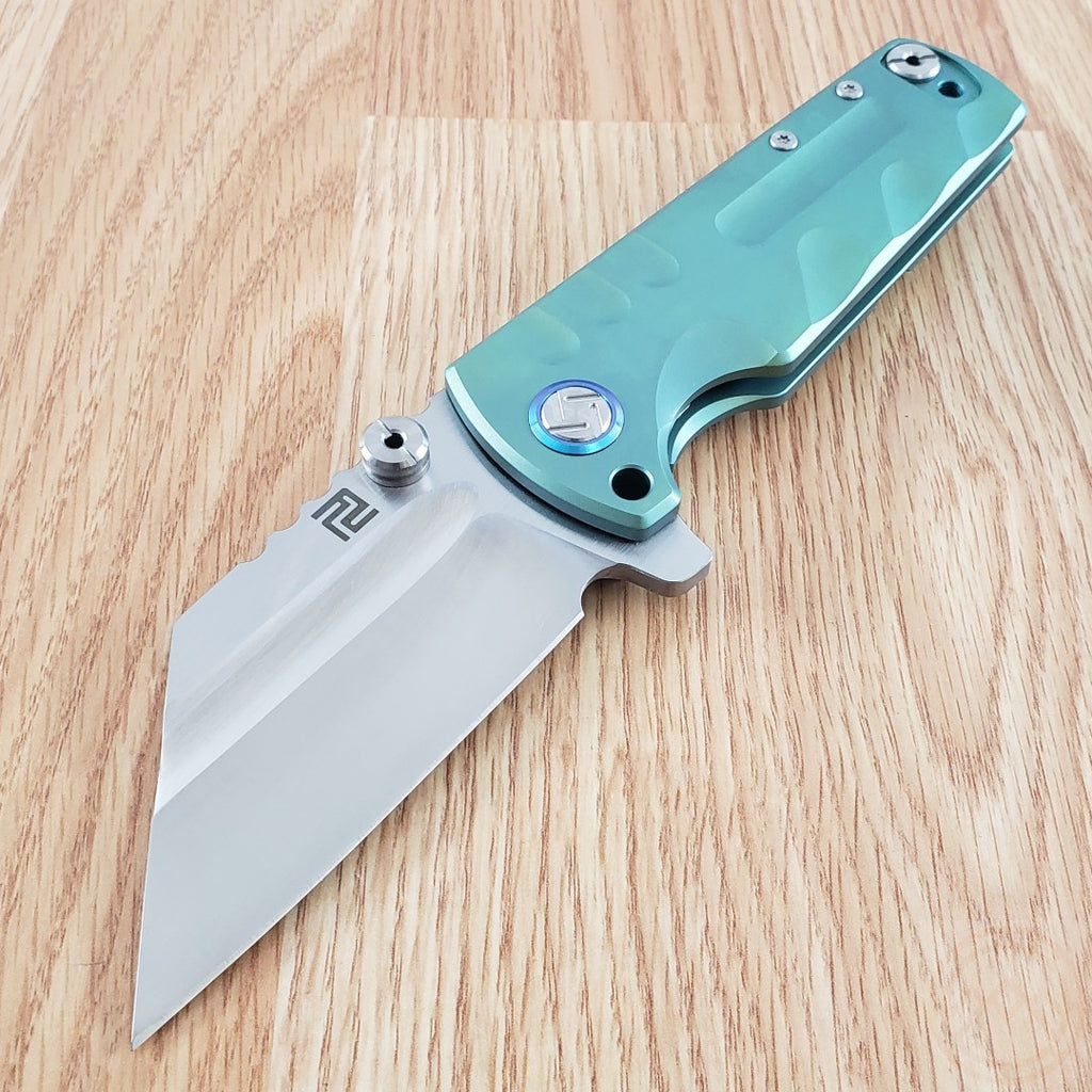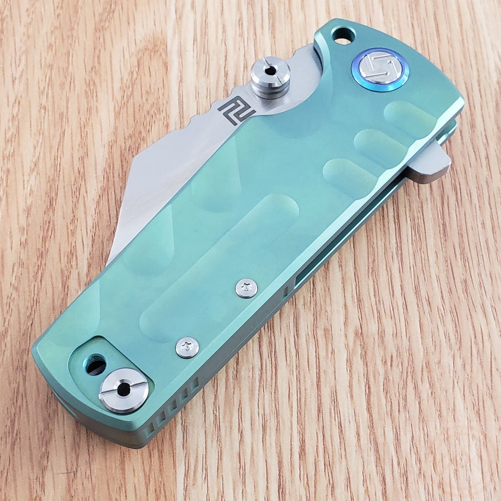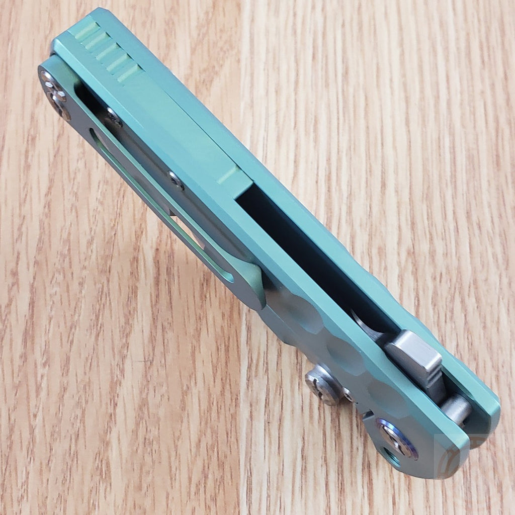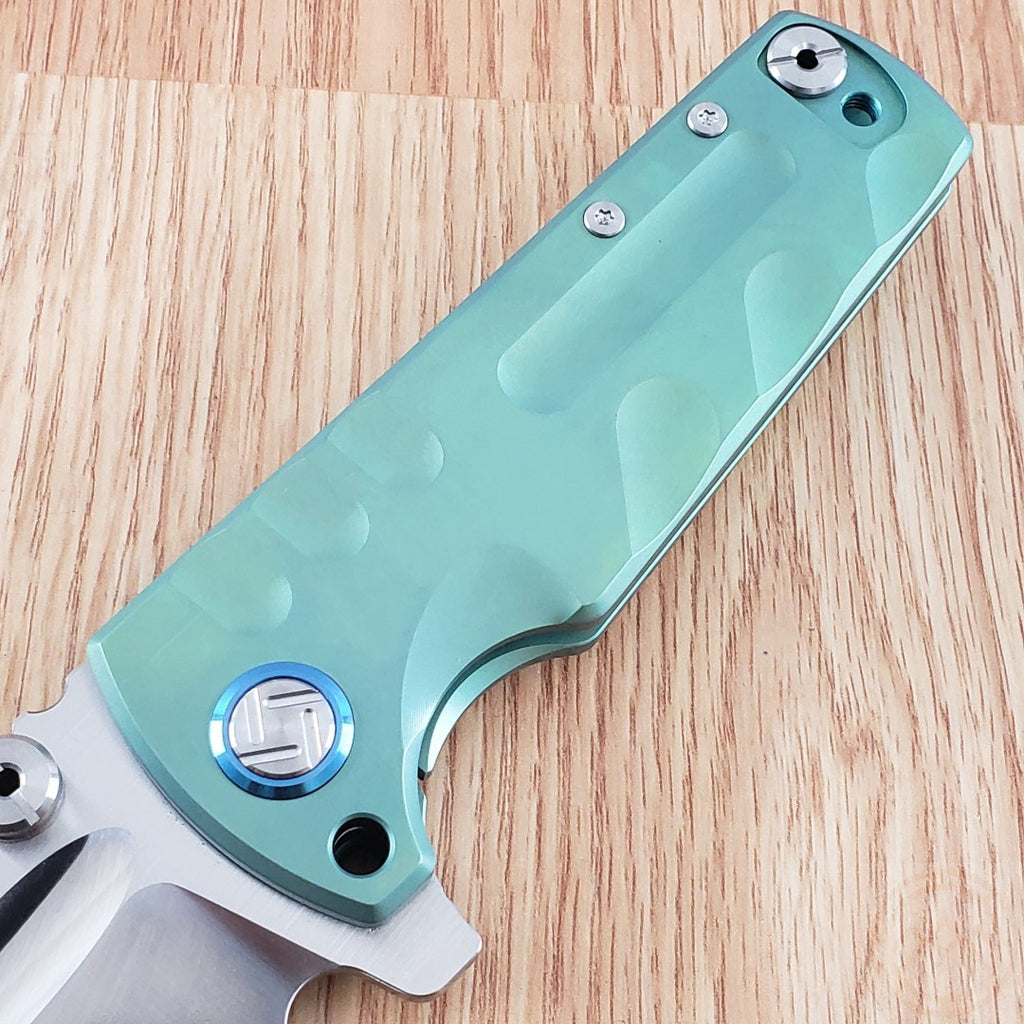 5" closed. 4" S35VN stainless modified tanto blade. Green titanium handle. Extended tang. Lanyard hole. Thumb stud. Pocket clip. Satin finish and sand polished blade. Ceramic ball bearing. Metal tin. Black nylon zippered storage case. Designed by Dirk Pinkerton. Boxed.
