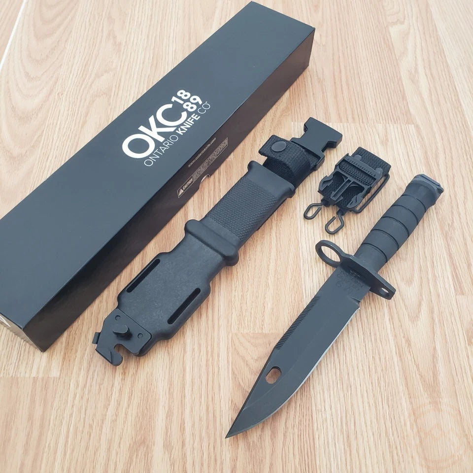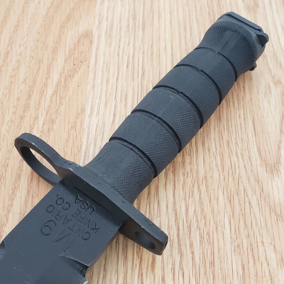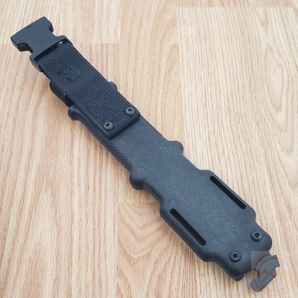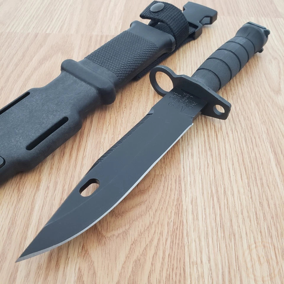 12.4" (31.5cm) overall. 7" (17.78cm) black oxide coated 420 stainless blade. Black thermoplastic handle. Milled saw teeth on top edge of blade. Handle with black oxide coated steel guard and cap. Black thermoplastic nylon scabbard with wire cutter and universal military holster. Fits M-16 rifle.