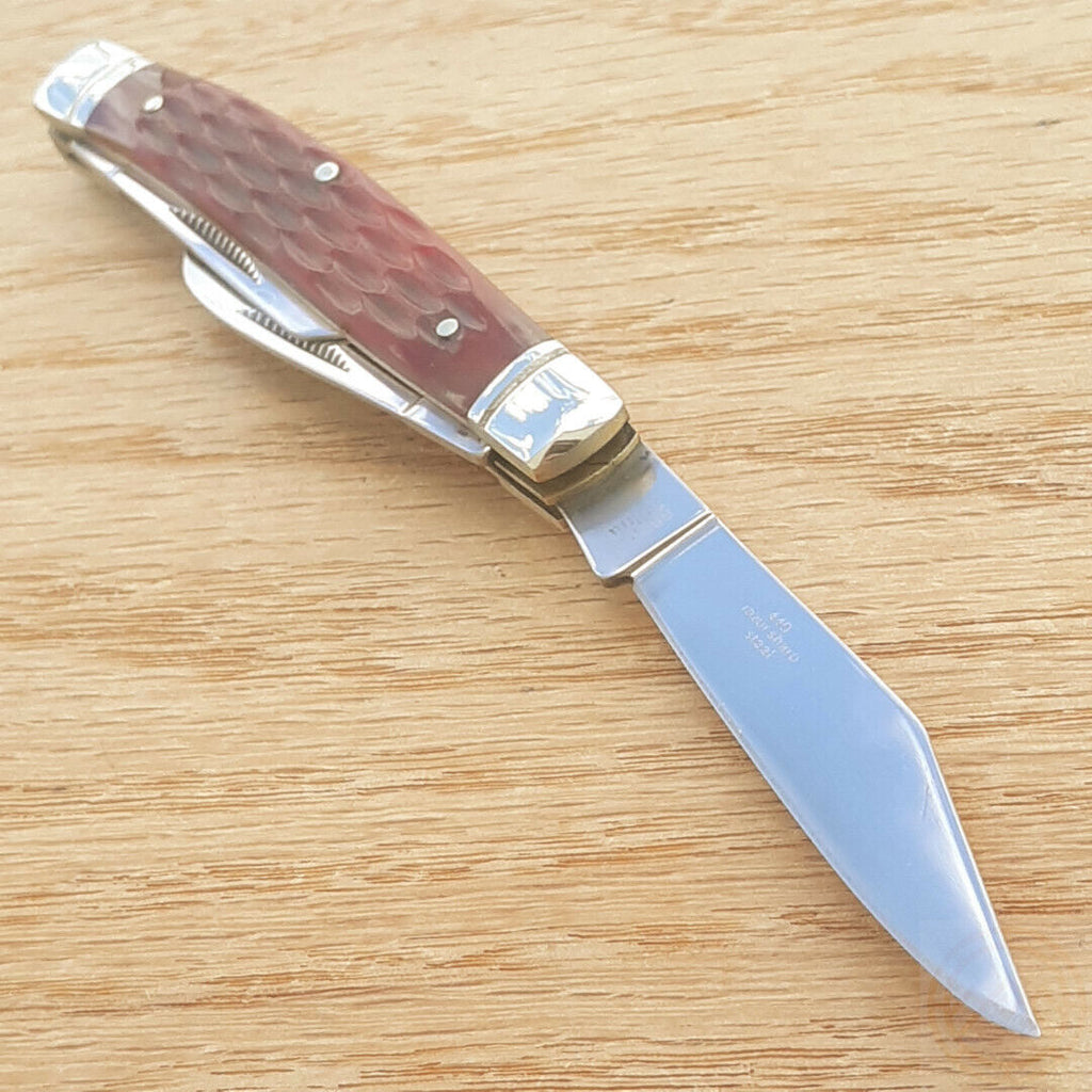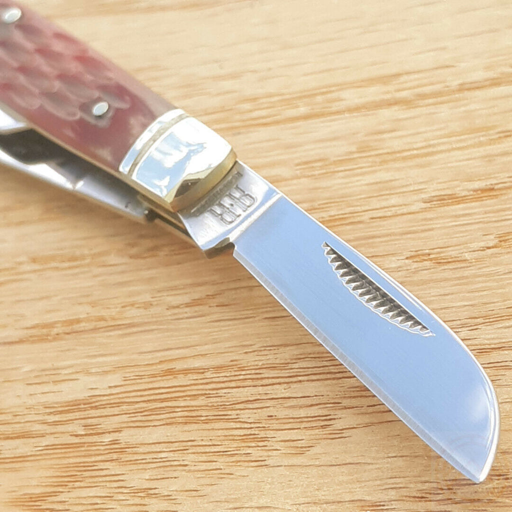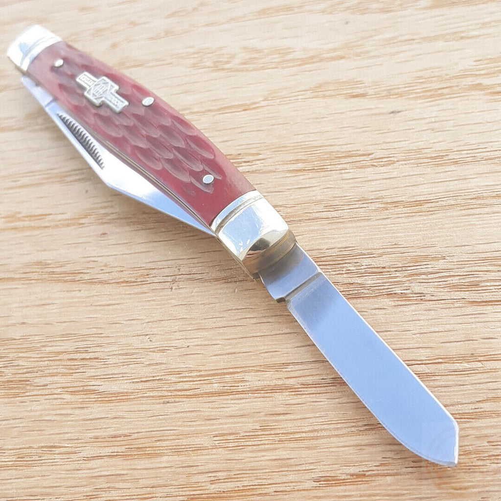 3.25" closed. 440 stainless clip, spey, and sheepsfoot blades. Red jigged bone handle. Nickel silver bolster(s). Inlay shield. Boxed. The handle of this knife is made from cow bone.