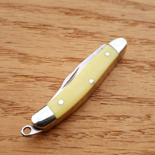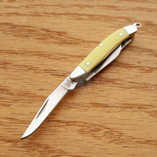 2" closed. 440 stainless clip, spey, and sheepsfoot blades. Yellow smooth bone handle. Nickel silver bolster(s). Lanyard hole. Boxed.