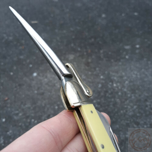 4.5" closed. 440 stainless sheepsfoot and marlin spike blades. Yellow smooth synthetic handle. Nickel silver bolster(s). Inlay shield. Bail. Boxed.