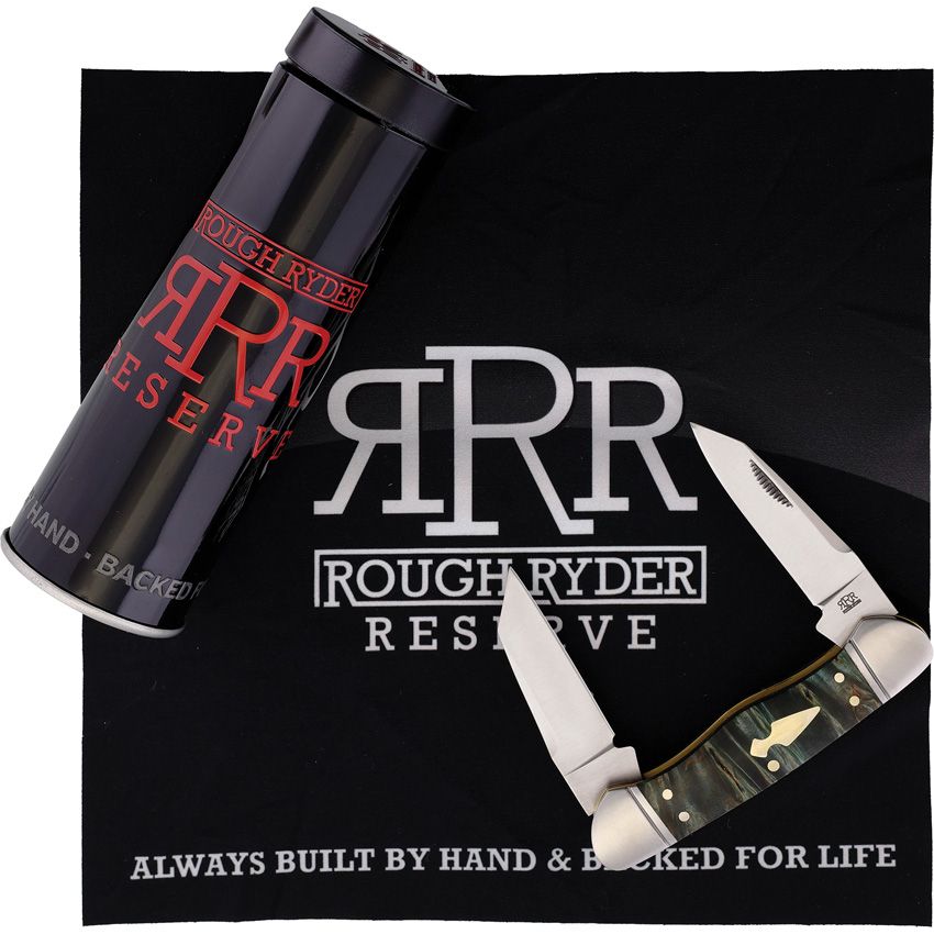 The Rough Ryder Reserve Green Stabilized Oak Kayak Pattern 018 features 2.25" stainless steel satin finished Wharncliffe and Sheepsfoot blades with half stops and match strike pulls. The handles are green stabilized oak with brass liners, nickel silver pins and bolsters, and a nickel silver arrowhead shield. It's 3.5" closed and weighs 3.53oz. Includes a Rough Ryder Reserve tin and microfiber cleaning cloth.