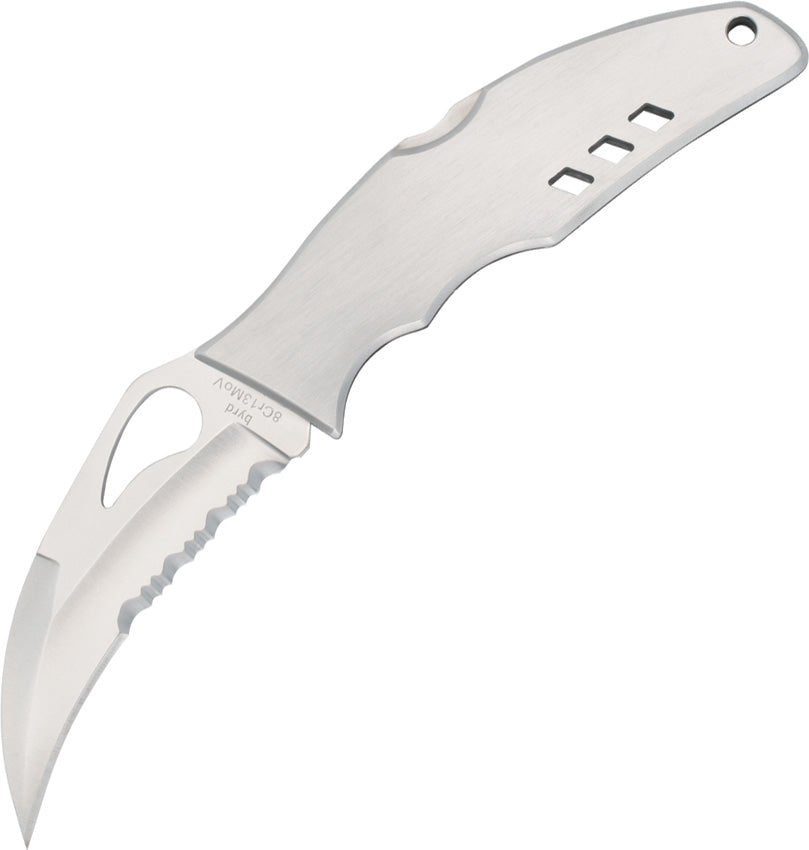 4 5/8" closed lockback. 8Cr13MoV stainless partially serrated curved design blade with thumb slot. Brushed stainless handles with stainless pocket clip. Lanyard hole. Boxed