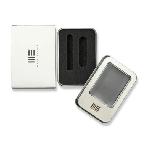 2.13" overall. Blue anodized finish titanium construction. Brown paracord lanyard. Boxed.