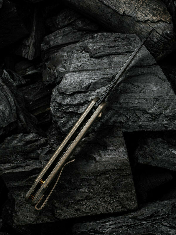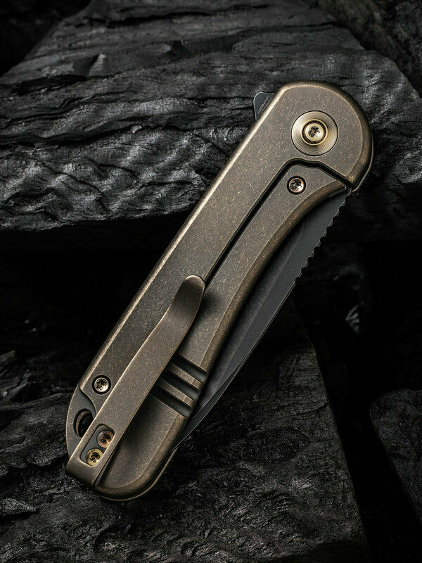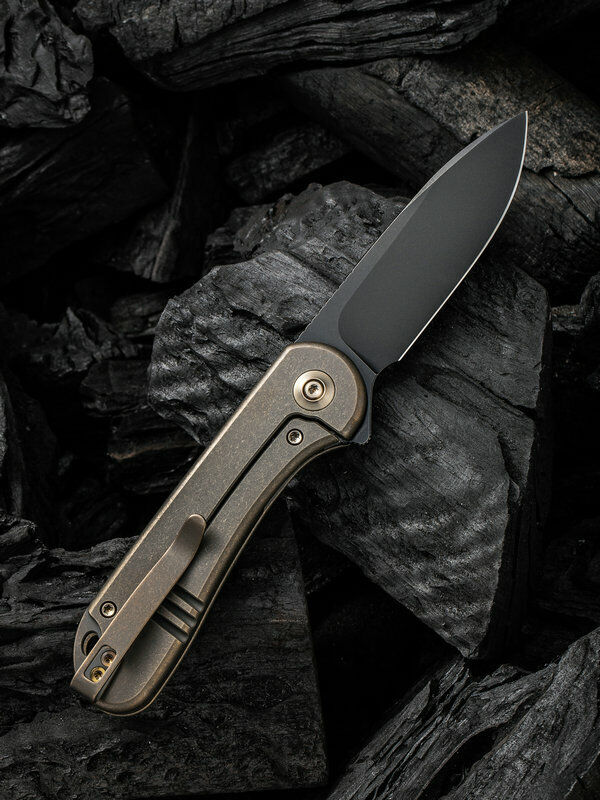 4" (10.16cm) closed. 3" (7.62cm) black stonewash finish CPM-20CV stainless blade. Bronze stonewash finish titanium handle. Extended tang. Lanyard hole. Pocket clip. Black nylon zippered storage case. Boxed.
