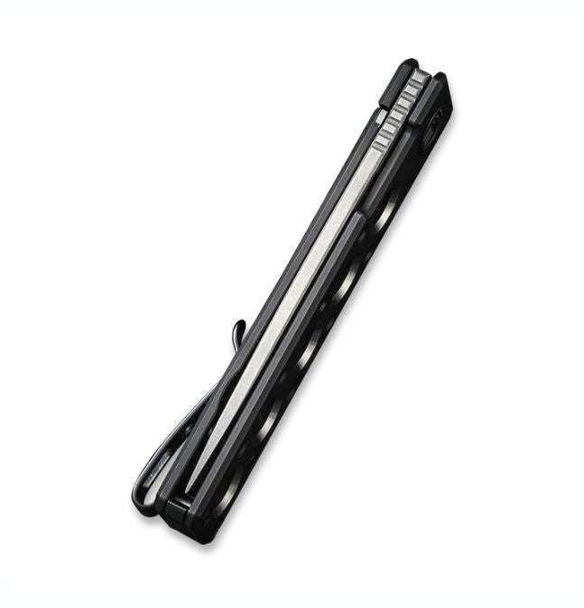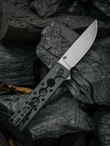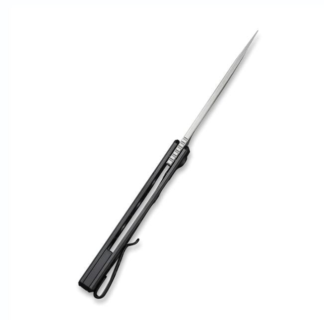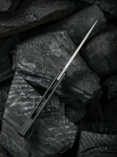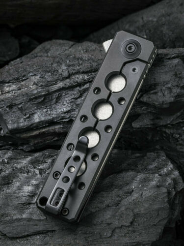 4.88" (12.4cm) closed. 3" (7.62cm) stonewash finish CPM-20CV stainless blade. Black titanium handle. Extended tang. Lanyard hole. Pocket clip. Black nylon zippered storage case. Boxed.