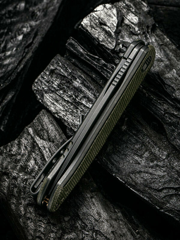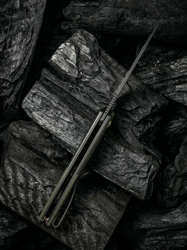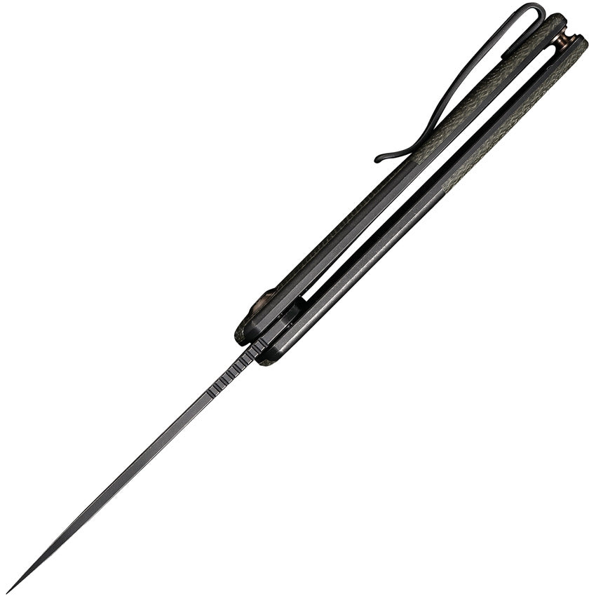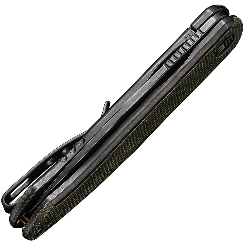 4" (10.16cm) closed. 3" (7.62cm) black stonewash finish CPM-20CV stainless blade. Black titanium handle with Green micarta inlay. Extended tang. Pocket clip. Boxed.